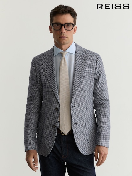 Reiss Navy Piccolino Houndstooth Single-Breasted Blazer Cotton-Blend Tailored-Fit