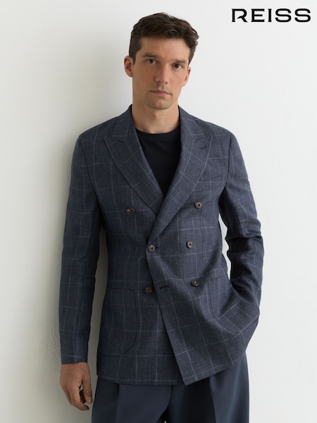 Reiss Navy Adoro Linen Check Double-Breasted Tailored-Fit Blazer