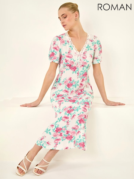 Roman White Lace Trim V-Neck Chiffon Midi Dress
