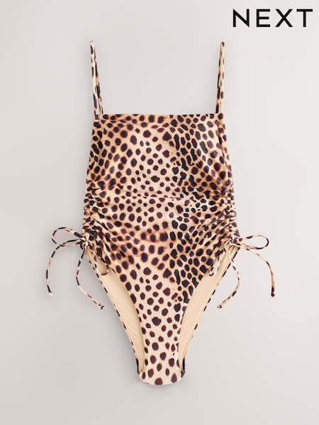 Brown Leopard Print Ruched Tummy Control Square Neck Swimsuit